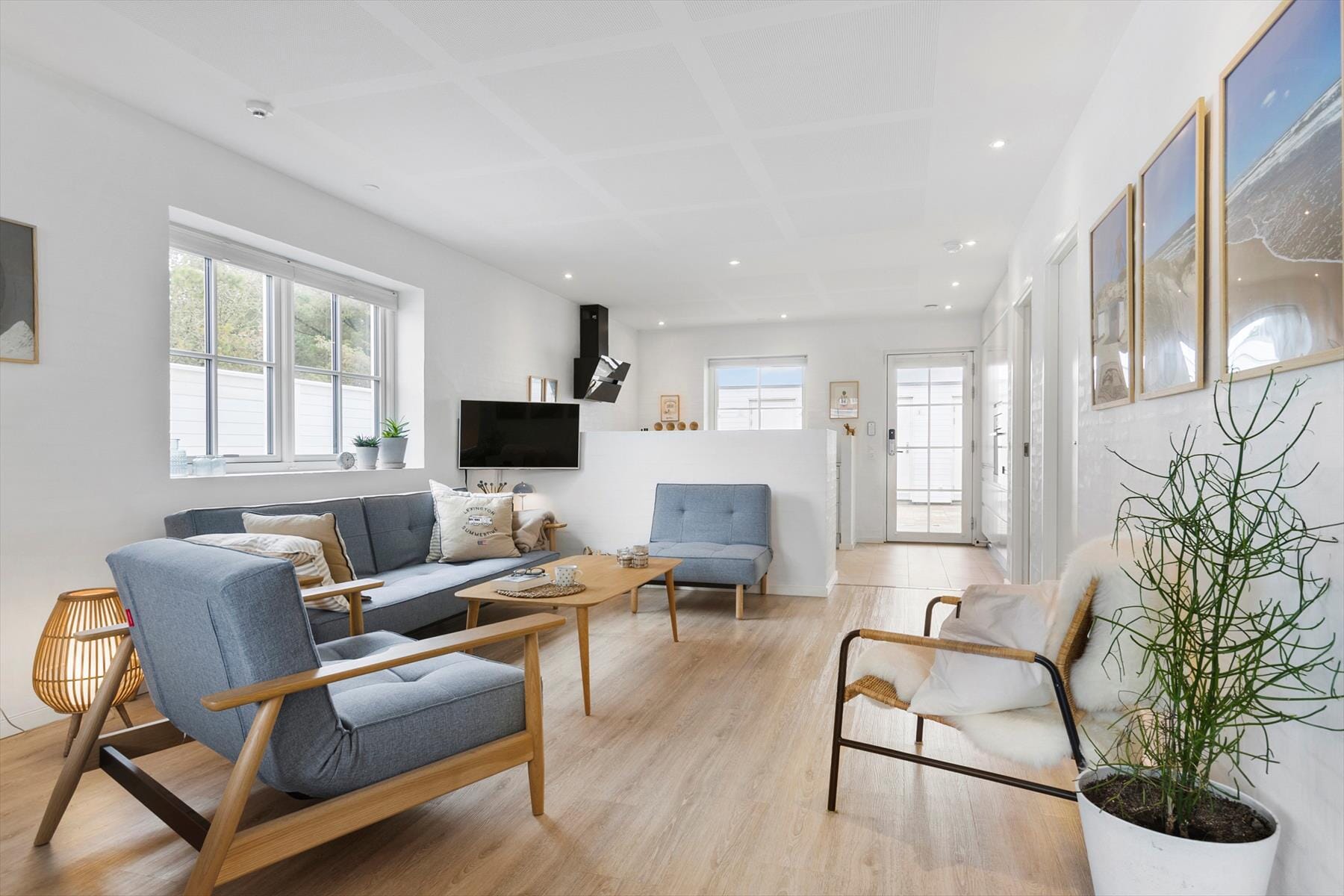 Stugor i Blokhus Strand og By, Nordjylland, med plats för 4 vuxna. Trevlig inredning, och det finns dessutom tvättmaskin, diskmaskin och torktumlare i bostaden.