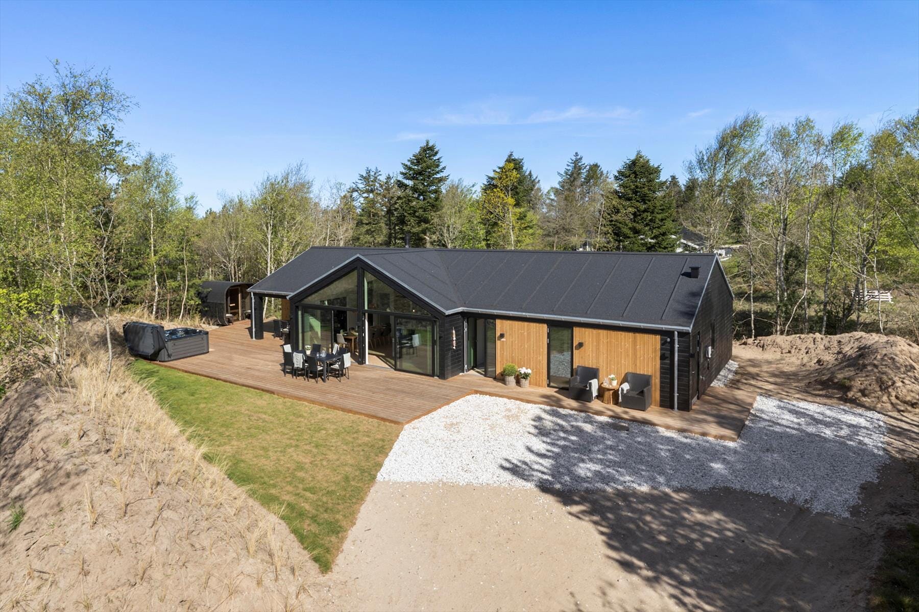 Stugor i Blokhus Strand og By, Nordjylland, med plats för 10 vuxna, 4 barn och 2 husdjur. Trevlig inredning, och det finns dessutom tvättmaskin, diskmaskin och torktumlare i bostaden.