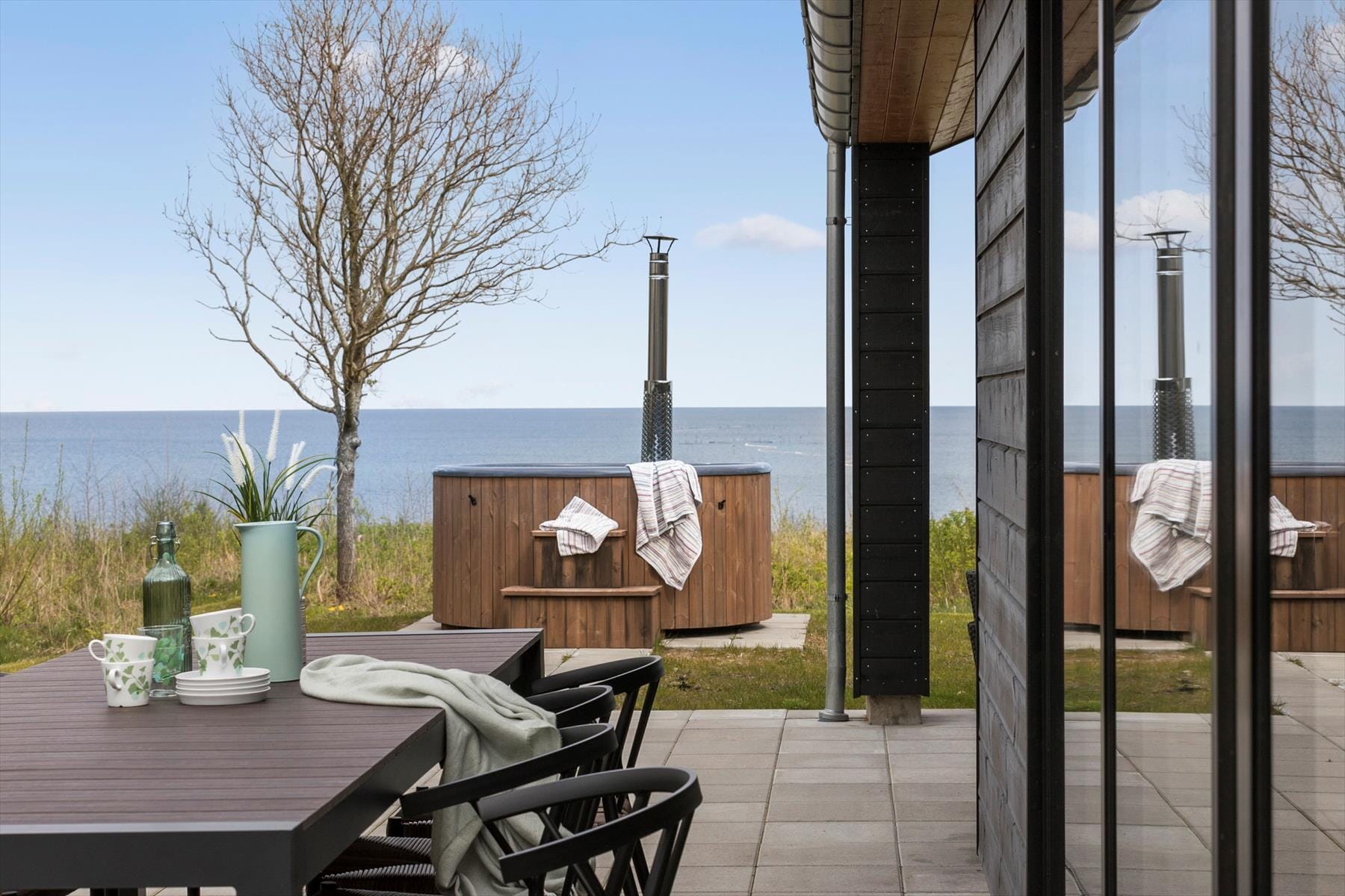 Tænk at bo i et nybygget sommerhus med grund helt ud i vandet. Huset ligger højt hævet over vandet og der er privat trappe til stranden, hvor der er meget få mennesker. Mest af alt hunde lufter, fiskere og motionister. I al slags vejr, nyder vi naturen ved havet og udsigten fra huset såvel indefra som fra den dejlige terrasse og vildmarksbadet.