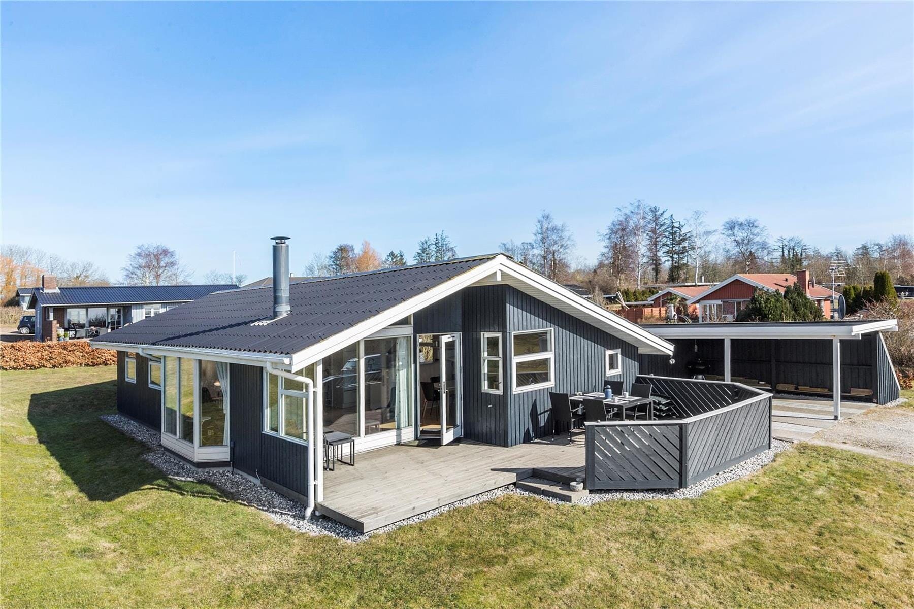 Stugor i Følle Strand, Östjylland, med plats för 6 vuxna. Trevlig inredning med bl.a. brasa, och det finns dessutom tvättmaskin och diskmaskin i bostaden.