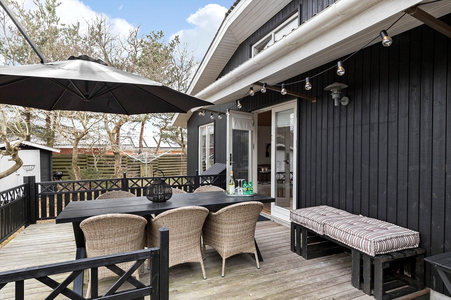 Stugor i Fjellerup strand og by, Östjylland, med plats för 6 vuxna och 2 husdjur. Trevlig inredning med bl.a. brasa, och det finns dessutom tvättmaskin och diskmaskin i bostaden.