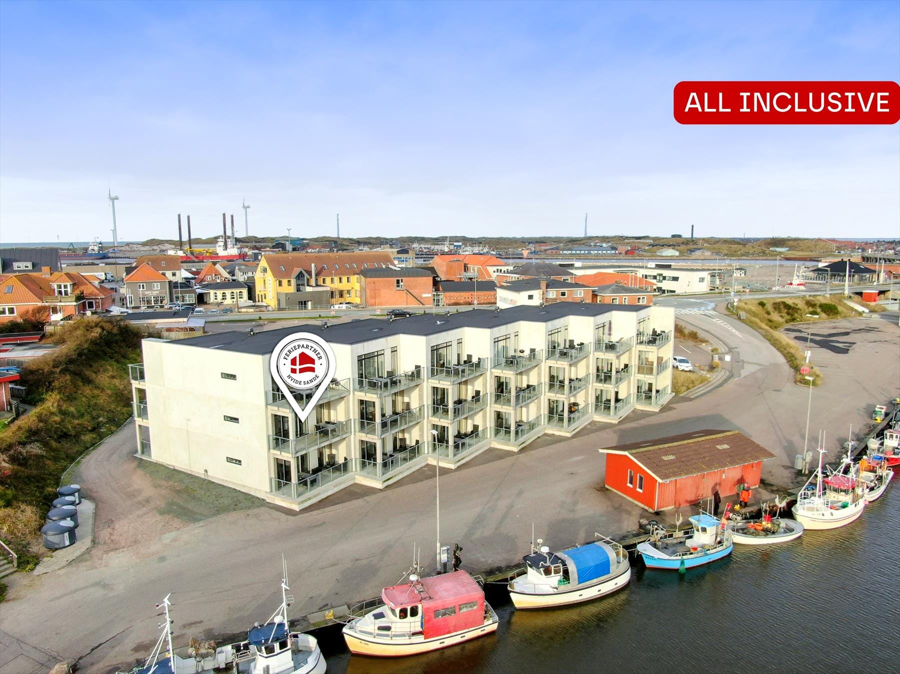 Lägenhet i Hvide Sande Strand og By, Västjylland, med plats för 4 vuxna och 1 husdjur. Trevlig inredning, och det finns dessutom tvättmaskin, diskmaskin och torktumlare i bostaden.