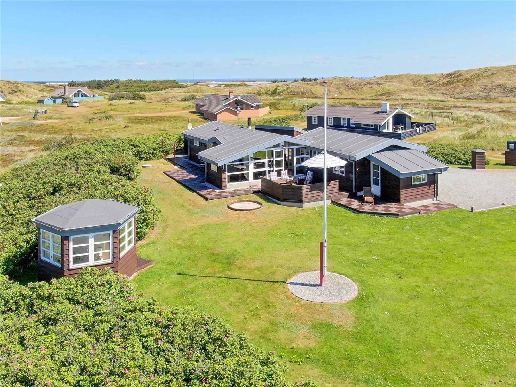 Stugor i Aargab, Västjylland, med plats för 6 vuxna och 1 husdjur. Trevlig inredning med bl.a. brasa, och det finns dessutom tvättmaskin, diskmaskin och torktumlare i bostaden.