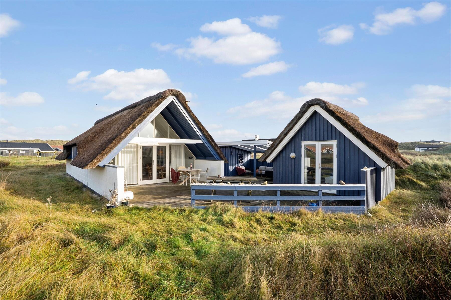 Stugor i Aargab, Västjylland, med plats för 4 vuxna och 2 husdjur. Trevlig inredning med bl.a. brasa, och det finns dessutom diskmaskin i bostaden.