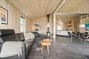 Stugor i Kollerup Klit, Nordjylland, med plats för 6 vuxna och 2 husdjur. Trevlig inredning med bl.a. brasa, och det finns dessutom tvättmaskin, diskmaskin och torktumlare i bostaden.