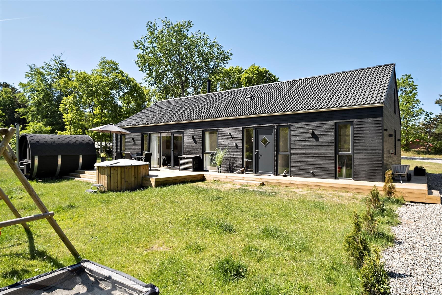 Bostaden är 140 kvm stor med en tomt på 4 306 kvm, där det bl.a. finns gungor och sandlåda.