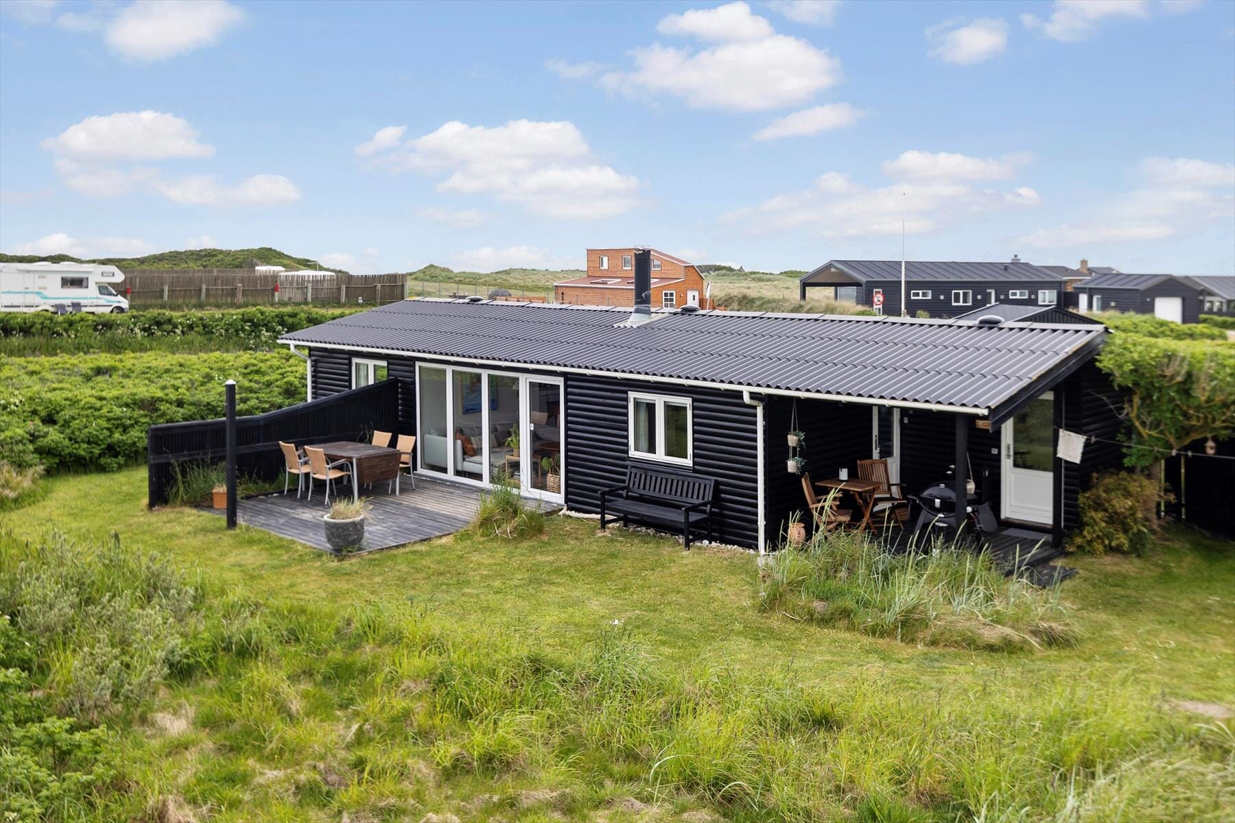Stugor i Furreby, Nordjylland, med plats för 5 vuxna och 1 husdjur. Trevlig inredning med bl.a. brasa, och det finns dessutom tvättmaskin, diskmaskin och torktumlare i bostaden.