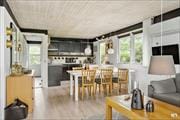 Sommerhuset er lyst og hyggeligt indrettet med en rolig og hjemlig atmosfære, der straks byder dig velkommen. Her kan du trække stikket og give plads til alt det, der virkelig betyder noget – nærvær, afslapning og samvær. Det åbne opholdsrum binder køkken, spiseplads og stue sammen, så hele familien naturligt samles i dagens løb. Den klassiske brændeovn spreder varme og stemning, særligt på kølige aftener, hvor flammernes knitren og en kop varm te kan være den perfekte afslutning på dagen. De store vinduer trækker dagslyset ind og giver et fint kig til haven, så du også inde fra kan følge med i fugleliv og vejrskift. Her er både plads og ro nok til, at både familier og vennepar kan nyde en pause fra hverdagen.