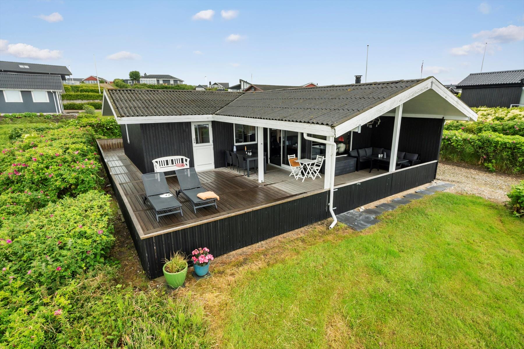 På den store, kuperede grund er der rig mulighed for at finde sin egen lille plet til afslapning eller leg. Uanset hvor solen står, er der næsten altid et godt hjørne at slå sig ned i på den rummelige terrasse, som går næsten hele vejen rundt om huset. Her kan du nyde dagens måltider i det fri, tage en stille stund med kaffe og udsigt – eller måske bare læne dig tilbage og mærke sommerbrisen i ansigtet. For børnene indbyder haven til leg på skrænterne og små eventyr i det grønne, og fjorden lokker kun få skridt væk med vandpjask og sandslotte. Bellisvej 75 ligger tilbagetrukket i sommerhusområdet og samtidig højt i landskabet, så du kan nyde roen og udsigten, helt uden at føle dig afskåret fra alt det, der gør ferie i Gjellerodde til noget særligt.