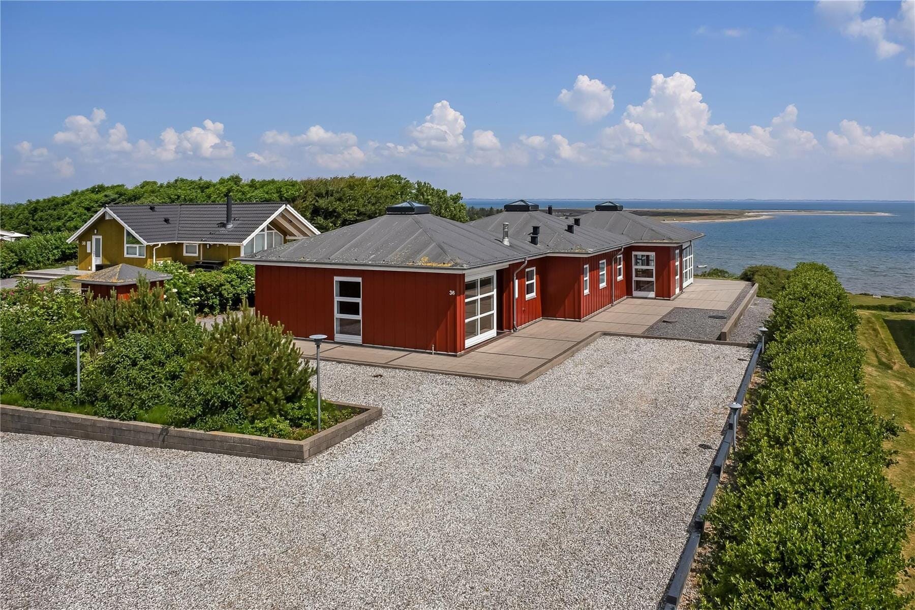 Terrassen mod øst er overdækket og fungerer som husets bedste udkigspunkt. Herfra har du en fortryllende panoramaudsigt over fjorden og det åbne landskab, der ændrer udtryk i takt med solens gang over himlen. Du kan nyde morgenkaffen med dugfriske smagsindtryk og kig til naturens spil – eller blive siddende under overdækningen, når duggen falder sidst på dagen. Rundt om huset ligger en grøn græsplæne, som børnene kan løbe og lege på, og selvom der er rigeligt at opleve i området, har du alt, hvad du behøver lige her: ro, rum og udsyn. Det er et perfekt sted at lægge telefonen fra sig og bare være til stede i nuet.