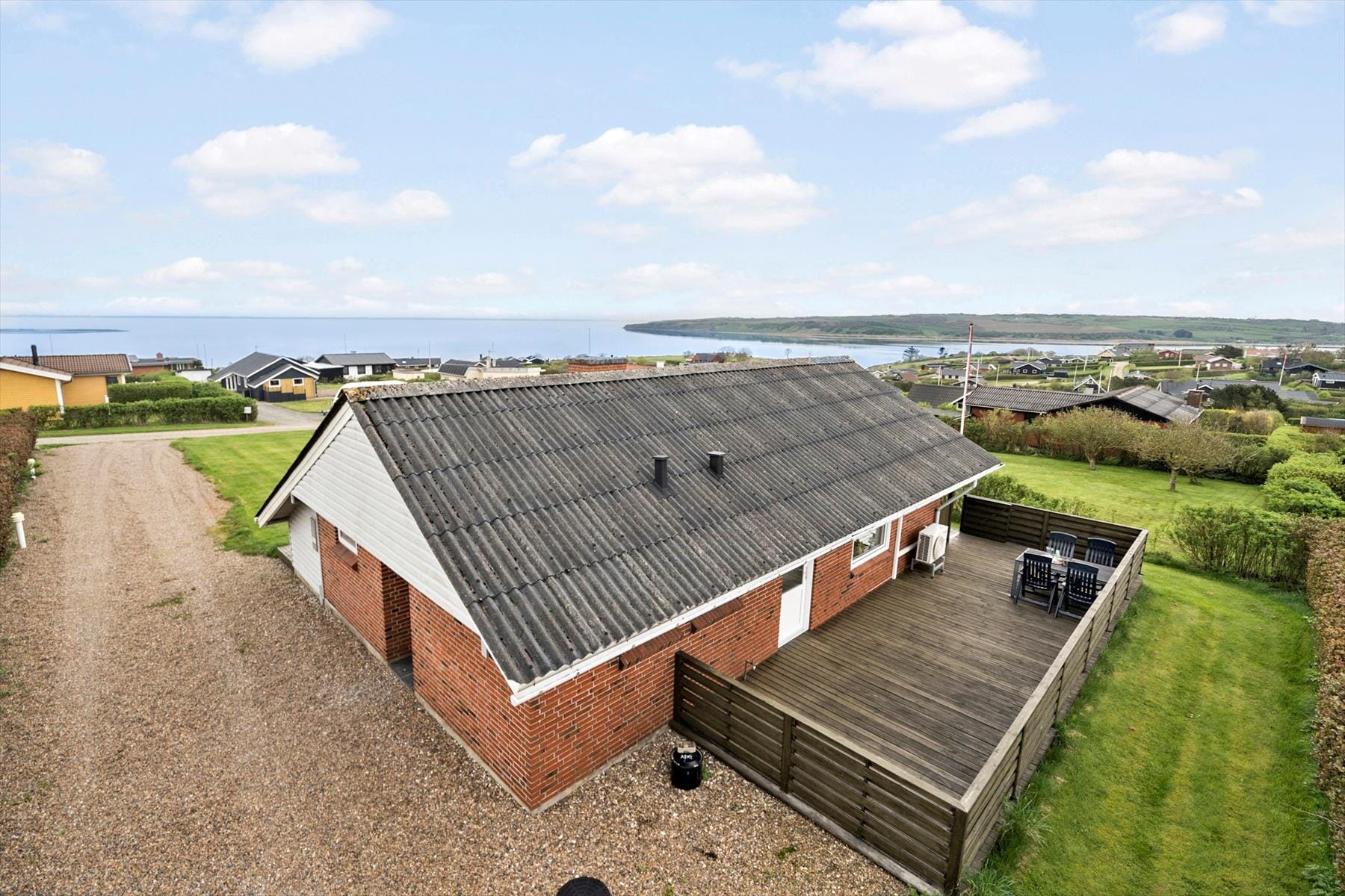 Terrassen er sommerhusets hjerte under åben himmel – og på Syrenvej 37 breder den sig elegant langs tre af husets sider. Det betyder, at du altid kan finde den helt rette plet, uanset om du søger morgensol, middagslæs eller aftenglød. Her er alle forudsætninger for at tilbringe hele dagen udendørs – med grillmad, bøger i liggestolen eller et glas vin i aftensolen. Den kuperede natur omkring huset giver både læ og en følelse af at være omsluttet af landskabet – og så er det næsten umuligt ikke at lade sig fascinere af det skiftende lys over fjorden, der hele tiden giver dig nye motiver at hvile øjnene på. Med det rolige sommerhusområde omkring dig og de mange muligheder for at nyde udelivet, bliver det svært ikke at sænke skuldrene og bare nyde nuet.