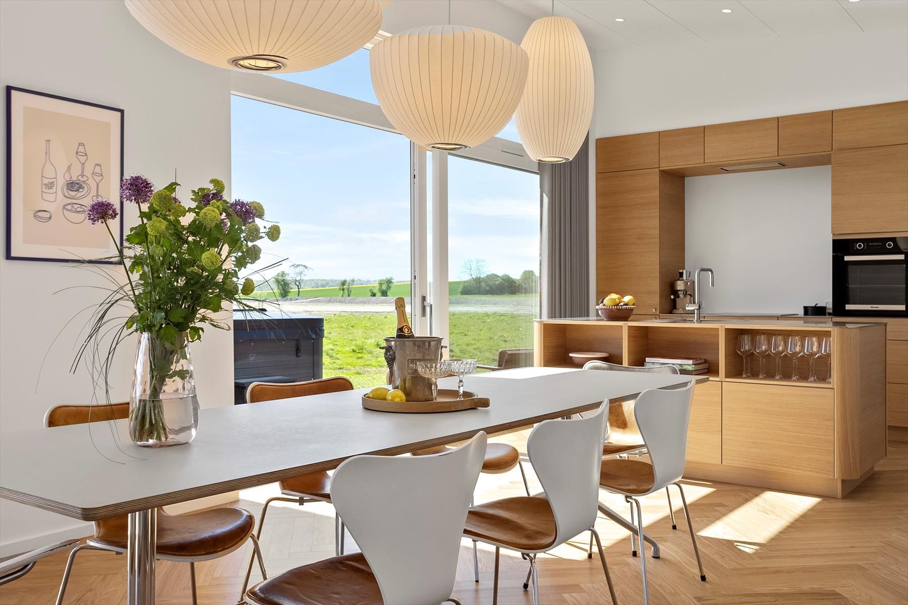 Det moderna köket ligger i öppen planlösning mot matplatsen och vardagsrummet – perfekt för gemensamma måltider och avkopplande stunder. Här kan du duka upp för god mat, läsa en bok eller njuta av sällskapet.