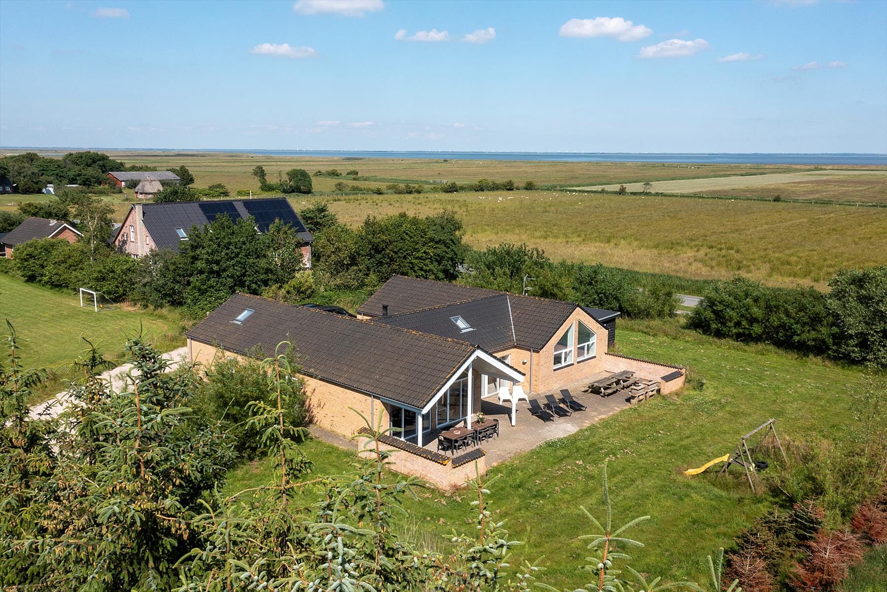 Bostaden är 240 kvm stor med en tomt på 2 782 kvm, där det bl.a. finns gungor och sandlåda.