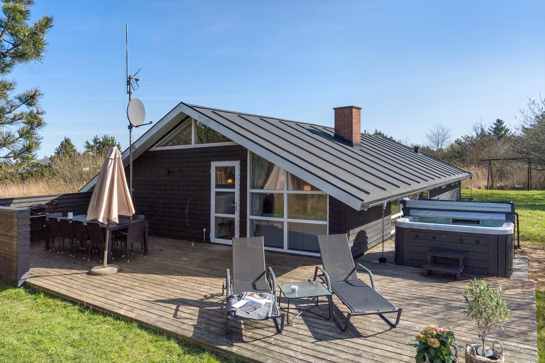 Stugor i Bolilmark, Västjylland, med plats för 8 vuxna och 2 husdjur. Trevlig inredning med bl.a. brasa, och det finns dessutom tvättmaskin och diskmaskin i bostaden.