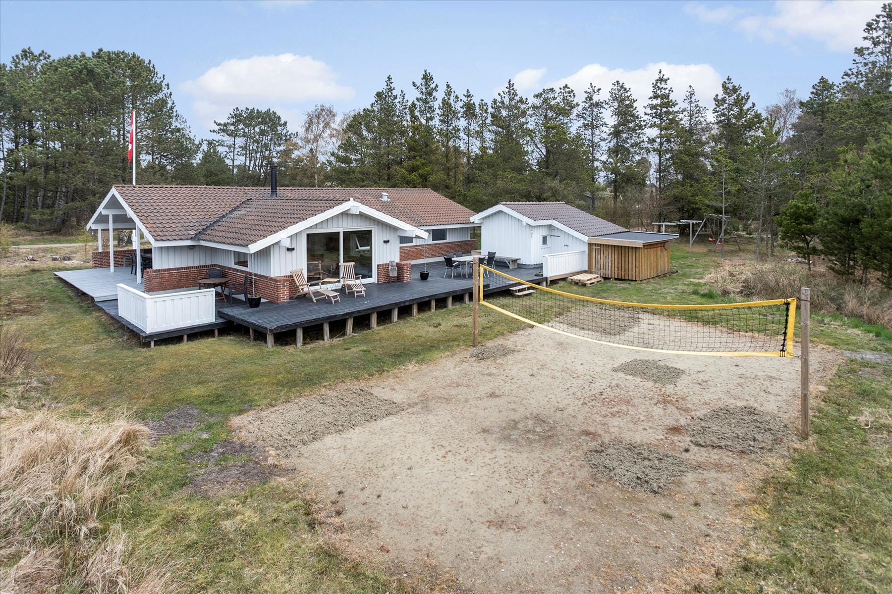 Stugor i Sønderstrand, Västjylland, med plats för 8 vuxna och 2 husdjur. Trevlig inredning med bl.a. brasa, och det finns dessutom tvättmaskin, diskmaskin och torktumlare i bostaden.
