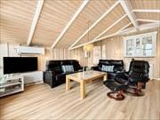 Stugor i Bolilmark, Västjylland, med plats för 6 vuxna. Trevlig inredning med bl.a. brasa, och det finns dessutom tvättmaskin och diskmaskin i bostaden.