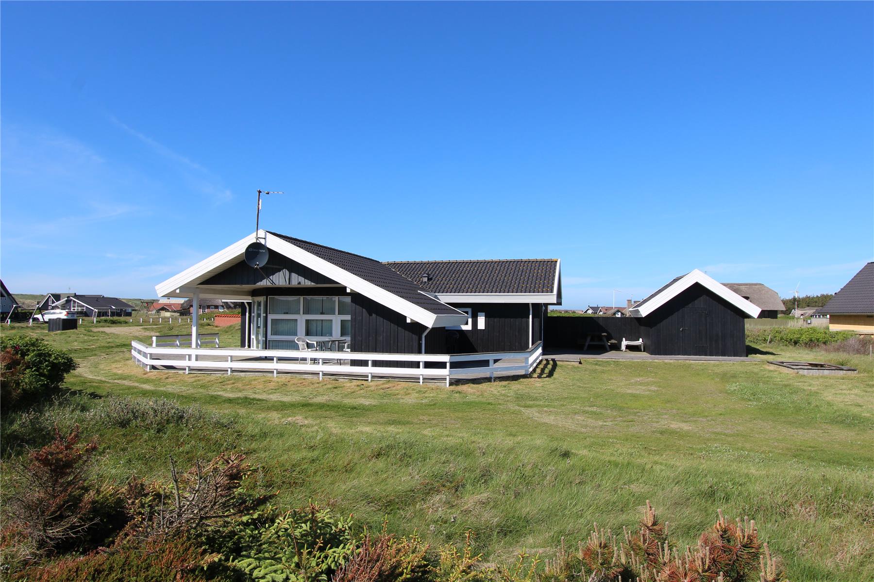 Når solen skinner eller vinden luner fra havet, inviterer terrassen og de hyggelige udendørsområder til afslapning og samvær. Her kan du finde læ og sidde i ro og mag med en god bog eller nyde et måltid under åben himmel med udsigt til den smukke natur omkring Vrist. Den korte afstand til stranden gør det nemt at tage spontane ture ned til vandet – måske med morgenkaffen i hånden eller bare for at dyppe tæerne i bølgerne. Børnene kan finde masser af plads til leg og boltre sig frit i de rolige omgivelser.