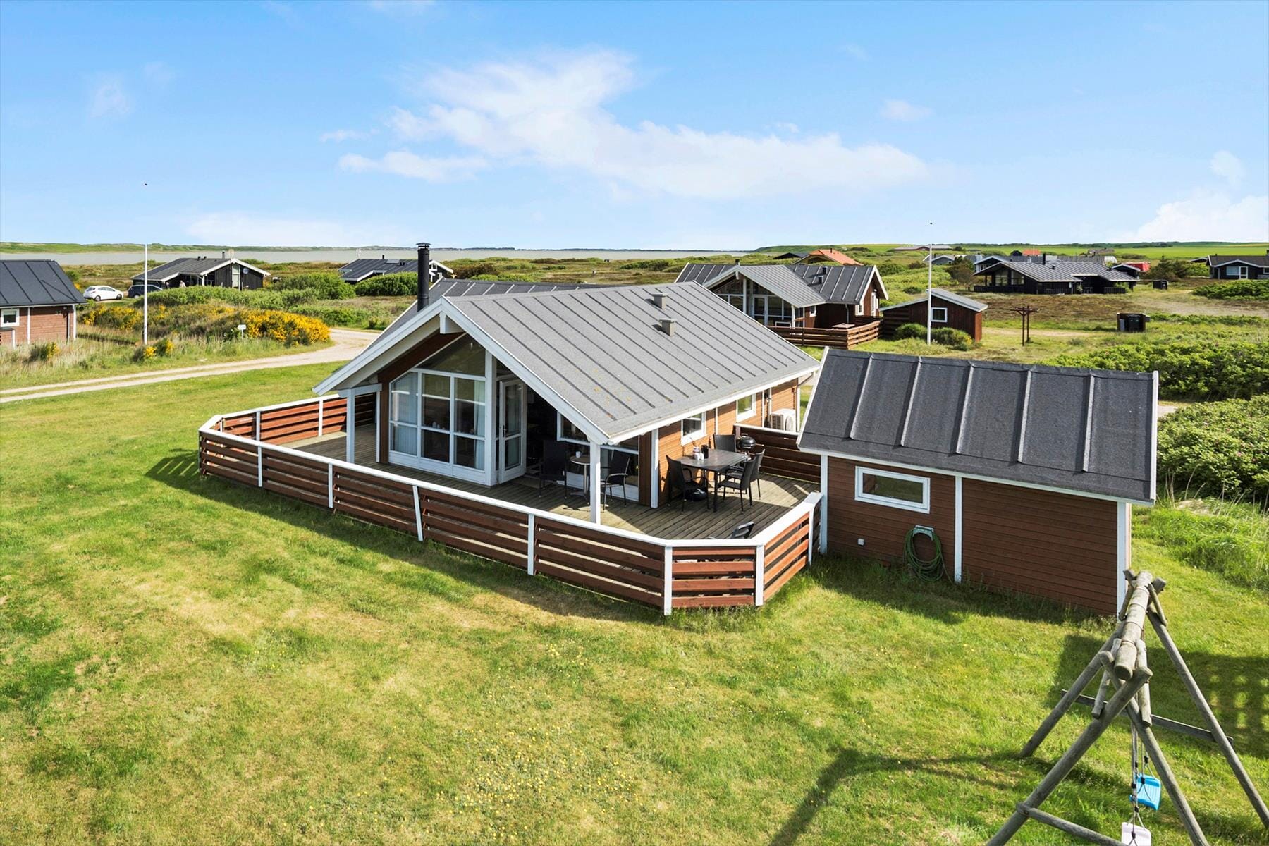 Rundt om huset breder en dejlig terrasse sig, så du altid kan finde et sted med sol, læ eller skygge – uanset tidspunkt på dagen. Her kan du starte dagen med en kop kaffe og fuglesang eller afslutte den med aftensmad under åben himmel, mens solen langsomt går ned. Den dejlige have skaber en grøn og fredelig kulisse for feriedagene, og børnene kan få mange gode timer til at gå med leg på græsplænen eller en tur i gyngestativet. Der er lagt op til både leg, afslapning og nærvær – og alt sammen kun 400 meter fra stranden. En kort gåtur bringer dig direkte til det brusende Vesterhav, hvor du kan bade, bygge sandslotte eller blot lade tankerne flyve til lyden af bølgerne.