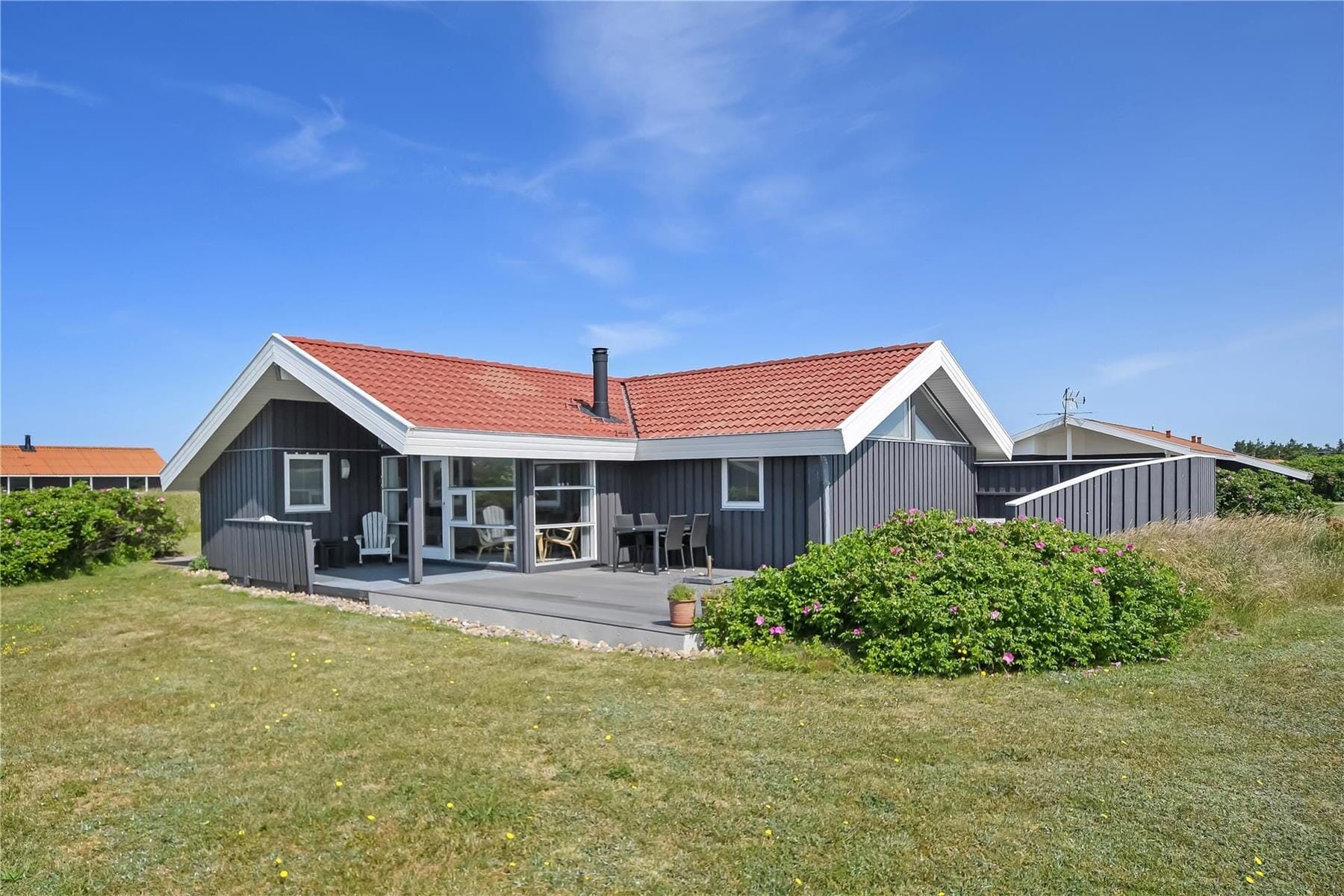 Den store, delvist afskærmede terrasse og den fredelige grund danner perfekte rammer om ferielivet i det fri. Her er der god plads til både leg og afslapning, og du kan nemt finde en solrig krog til formiddagskaffen eller en læfyldt plet til aftensmaden under åben himmel. Fordi terrassen er lukket, kan du roligt lade både børn og hund opholde sig udendørs, mens du selv nyder stilheden, lydene af naturen og måske en god bog i liggestolen. Om aftenen kan I tænde op i grillen, dække bord under åben himmel og lade dagen gå på hæld med udsigt til det åbne landskab og en stille vestjysk himmel.